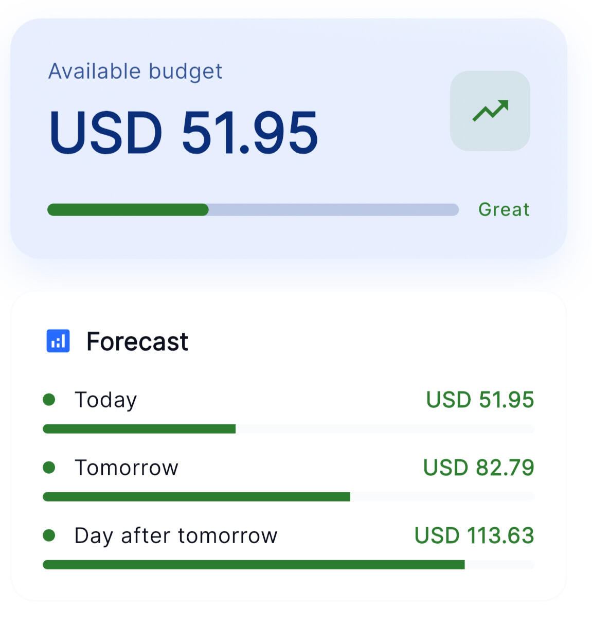 Define income, regular expenses and timeframe – get your daily budget in seconds.